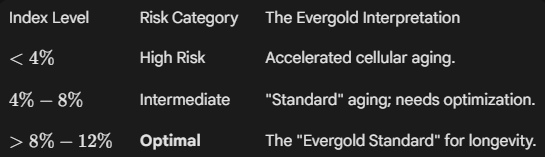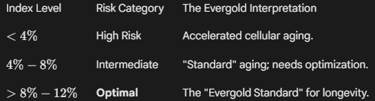 Most doctors never test your Omega-3 levels. At Evergold, we believe you cannot manage what you do not measure. We look at the Omega-3 Index—a blood test that measures the percentage of EPA and DHA in your red blood cell membranes.