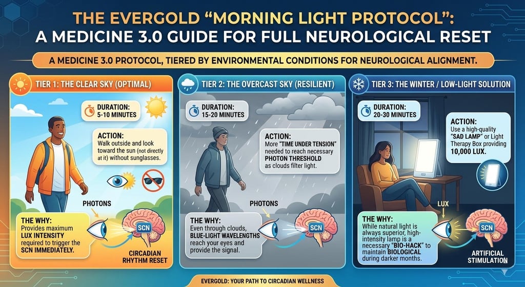 At EvergoldLongevity, we recognize that your internal clock is the most powerful lever you have for building Biological Capital. It dictates the timing of your hormones, the efficiency of your metabolism, and the clarity of your cognition. And while there are many ways to influence this clock, none are as potent—or as scientifically vital—as the arrival of photons on your retina within the first hour of waking.